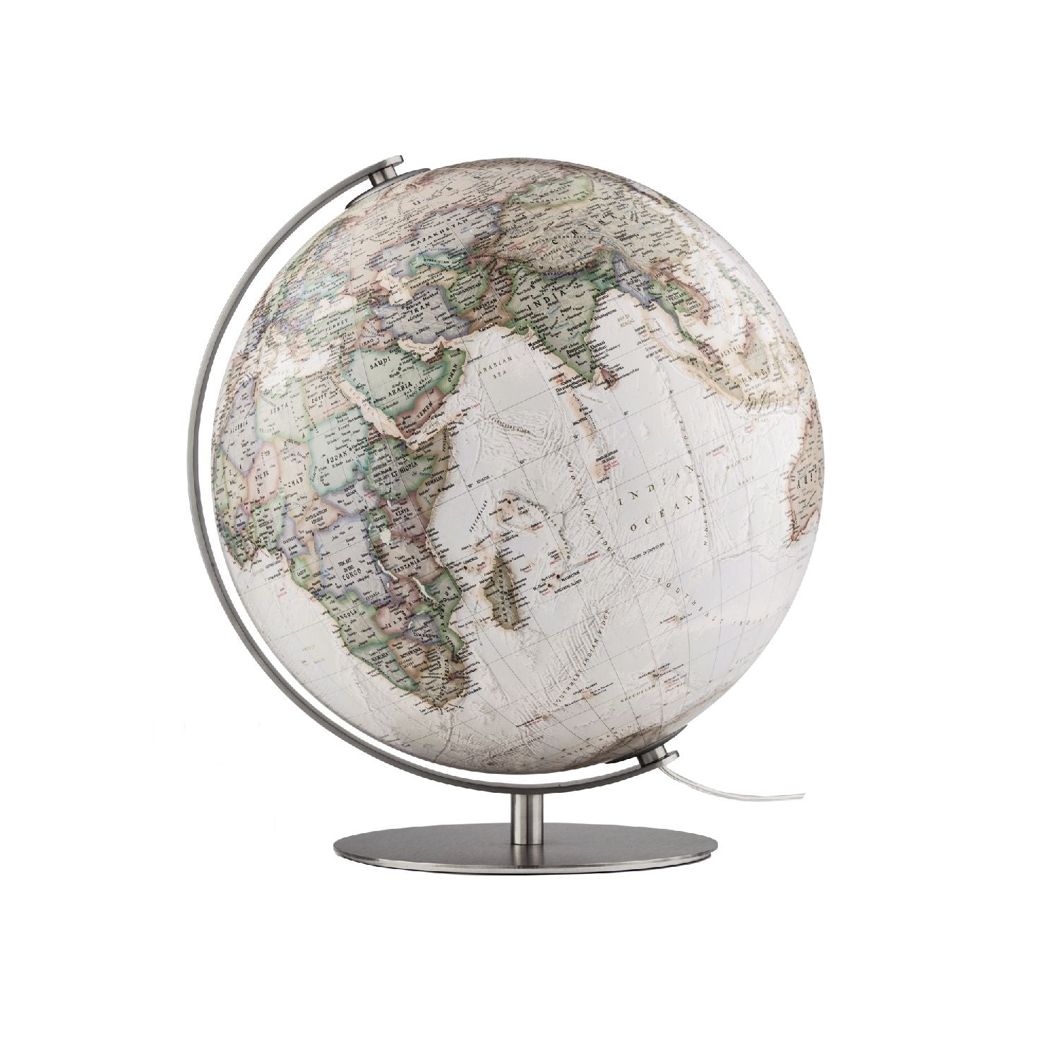 Die Weltkugel ist mit einem Meridian aus gebürstetem Edelstahl eingefasst, der Fuß ist ebenfalls aus Edelstahl. Der Globus hat eine Gesamthöhe von 43 cm.